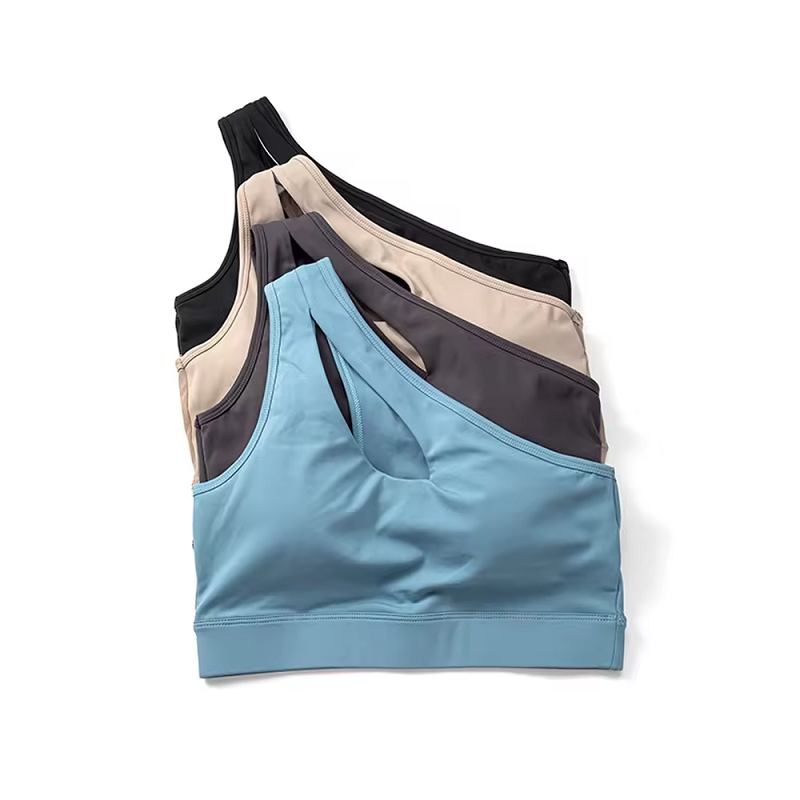 トレーニング、へそ出し、ヨガウェア、美背美胸、ブラトップ、無地インナー、ワンショルダー ブラトップ、カップ付き
